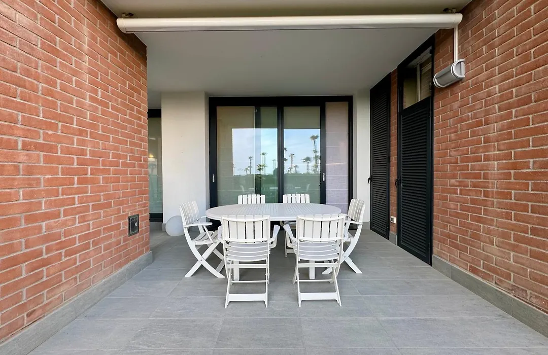 Frontemar Residenze Sul Mare - Carraro Immobiliare Jesolo - Family Apartments dispone di un patio e un salottino arredato con un divano. Gli ospiti possono usufruire di servizi multimediali come una TV a schermo piatto con canali satellitari, oltre a un impianto di climatizzazione per il loro comfort. Questa struttura comprende anche un bagno alla francese e una doccia.
